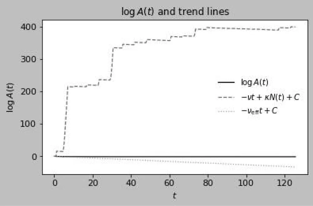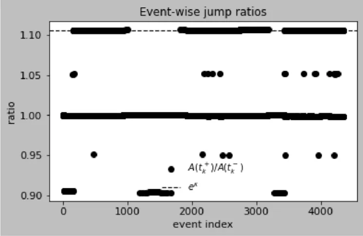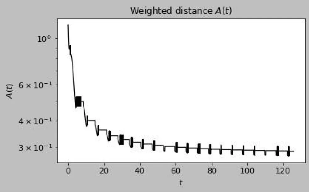 Discussion of figures. The numerical results are consistent with the theoretical framework and illustrate its key mechanisms. Figure 1 shows the weighted distance A(t) between two trajectories on a semilog scale: the staircase profile reflects the interplay between continuous contraction and discrete jumps, with exponential decay at rate