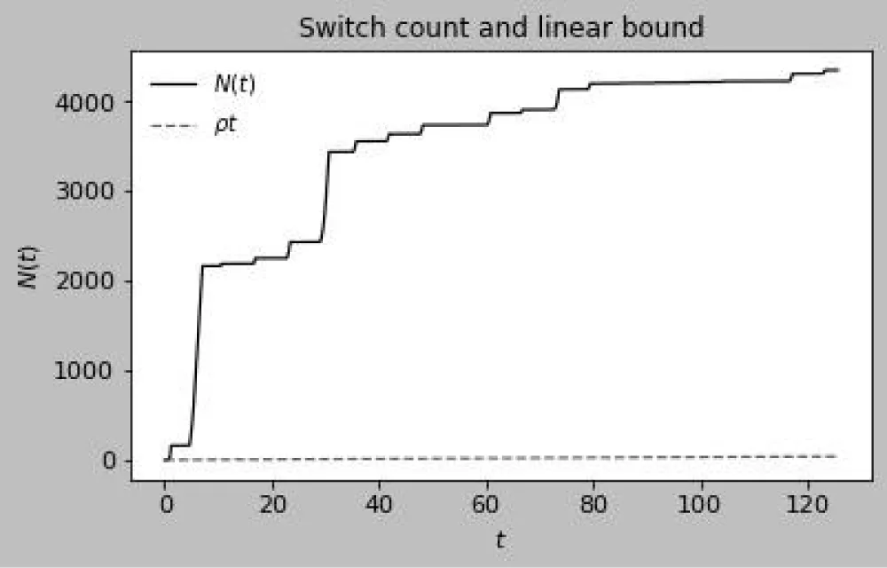 between events and multiplicative factors eκ applied at transversal crossings of the switching manifold, yielding an overall downward trend that anticipates the effective rate −νeff. This interpretation is reinforced in Figure 2, where logA(t) closely follows the theoretical bounds –νt + κN(t) + C and −νefft + C after a short transient, with slope matching the predicted −νeff = ν-ρκ. Figures 3 and 4 examine the event structure in more detail: jump ratios remain bounded by eκ, confirming Assumption 2(A3), while the cumulative switch count grows essentially linearly and respects the assumed envelope N(t) ≤ ρt + N0, with observed deviations attributable to numerical chatter near the manifold rather than genuine crossings. Metric equivalence is illustrated in Figure 5, where A(t) remains sandwiched between the Euclidean distances scaled by e±∥W∥∞, validating the transfer of contraction to the standard norm as formalized in Theorem 1. Sliding intervals, highlighted in Figure 6, demonstrate the applicability of Assumption 2(A4): during sticking, the tangential flow is nonexpansive while normal dynamics dissipate, ensuring contraction even in the absence of motion along Σ. The instantaneous decay rate shown in Figure 7 further corroborates the analysis: between events, dtd logA(t) remains below −ν, while discrete spikes at switching instants are bounded by κN(t), producing the average contraction profile. The long-term behavior is captured in Figures 8–9, where contractivity of the stroboscopic map
