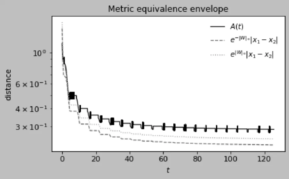 Figure 5: Metric-equivalence envelope for Theorem 1. The weighted distance