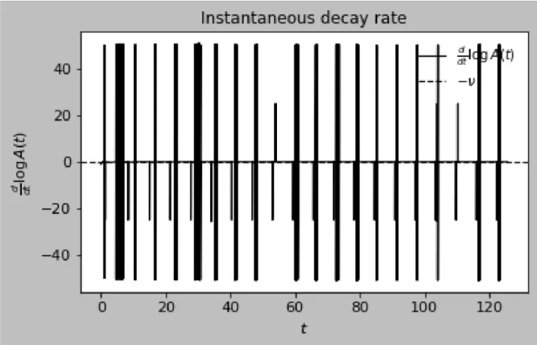 with reference line at −ν. Between jumps, the instantaneous decay does not exceed −ν, consistent with (A2) off Σ and (A4) on Σ