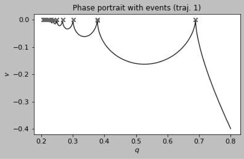 Figure 10: Phase portrait of trajectory 1 with event markers (crosses) at zero crossings of v. Sliding occurs along Σ = {v = 0} when the Filippov condition holds; slip arcs follow the piecewise-smooth vector field with Coulomb friction.
