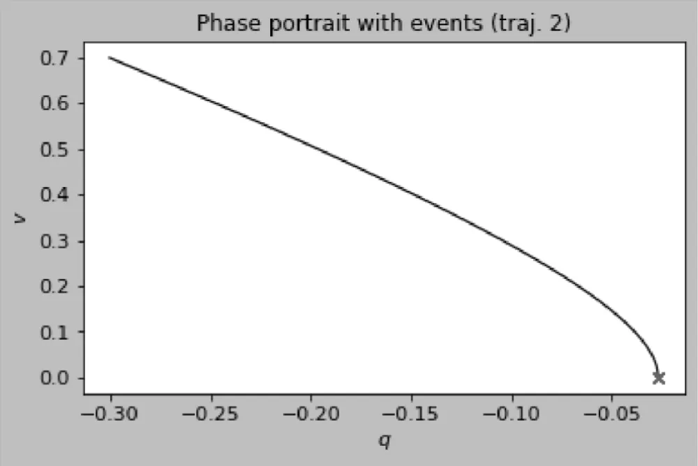 Figure 11: Phase portrait of trajectory 2 with event markers. Together with Figure 10, this illustrates how different initial conditions converge under the combined smooth/sliding contraction and bounded switching penalties.