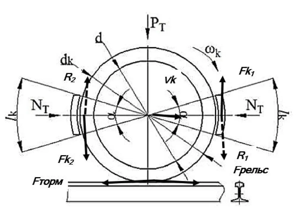 Fk1 and - friction forces arising when the brake shoe presses on the bandage with a force, while the sign changes depending on how the brake shoe is located (in front or behind the wheel in the direction of travel), which can be calculated using the formulas Fk2 NT.