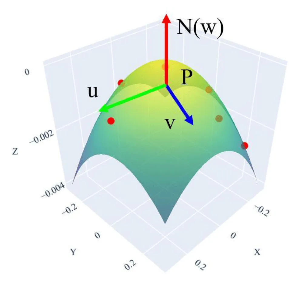 Local quadratic surface fitting method: To accurately capture the local geometric characteristics of a point cloud, we adopt a local coordinate-based quadratic surface fitting approach centered at a given point. This method involves establishing a local frame aligned with the surface normal and fitting a second-order surface to the nearest neighboring points in that frame, as shown in Figure 1. The procedure is detailed as follows:
