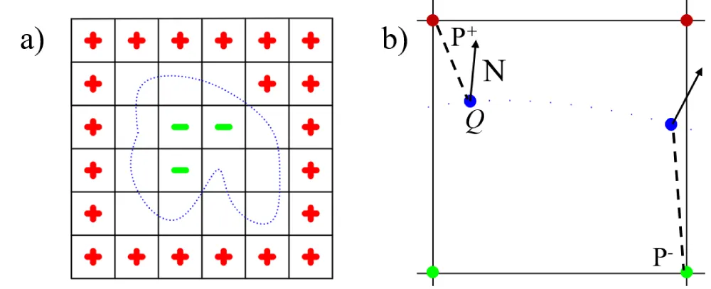 For each grid vertex P located near the surface boundary, the closest point Q on the input point cloud is identified, as illustrated in Figure 2b). A local coordinate system is constructed at Q, with the local z-axis is aligned to the normal vector N at that point. Within this local frame, the quadratic surface defined in Equation 8, is fitted to the neighboring points. This fitted surface serves as a smooth approximation of the local geometry near Q. Using the fitted coefficients a, b, c , the function is evaluated at the offset points P+ and P-, which are positioned slightly along the positive and negative directions of the normal vector, respectively:
