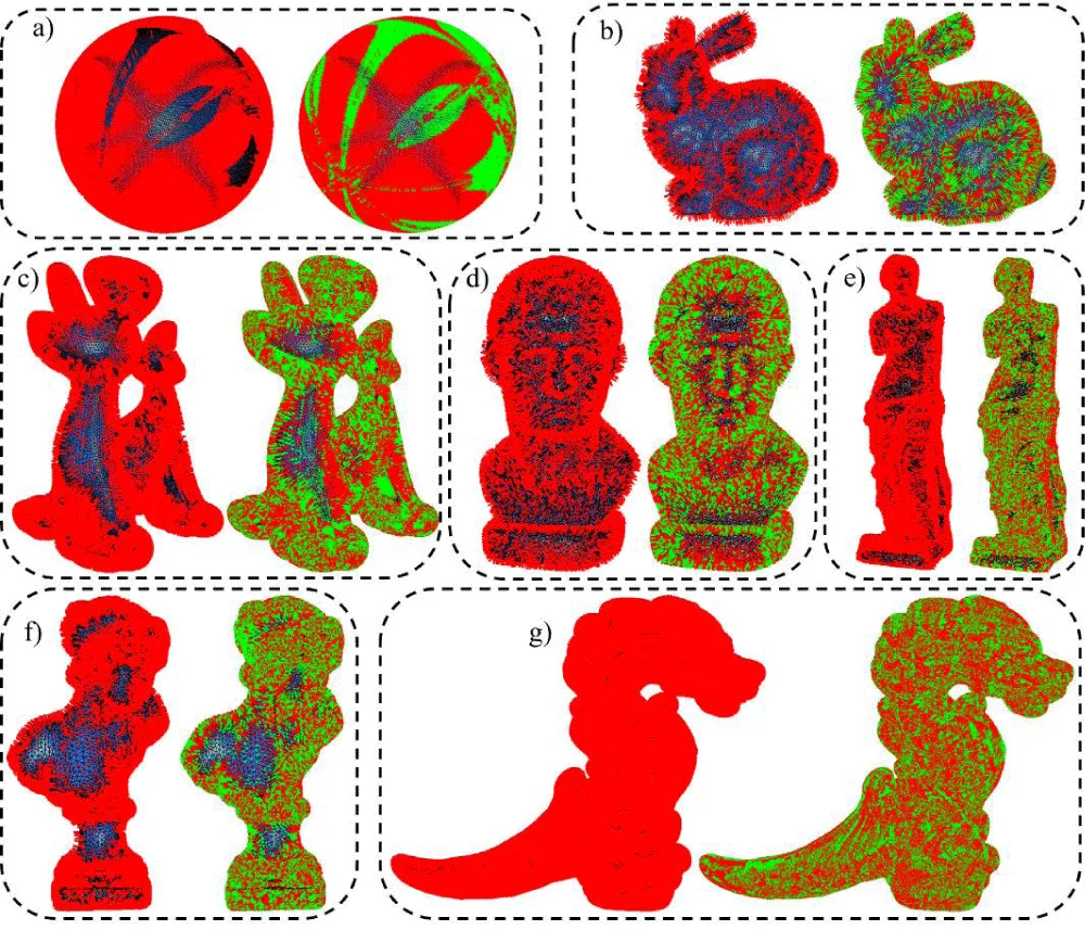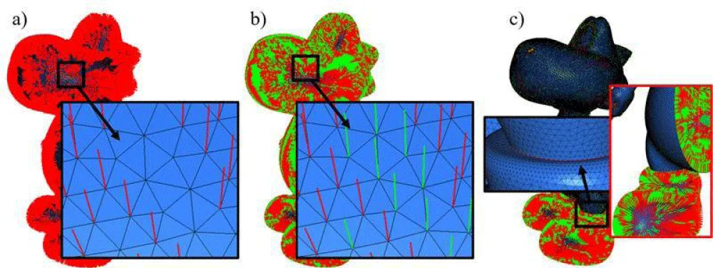 The results of the normal orientation correction are shown in Figure 3. As shown in Figure 3a), the initial normal vectors are inconsistent, with some pointing inward and others outward. After applying the proposed method, a globally consistent normal field is obtained. In Figure 3b), the red vectors represent the normal that were already correctly oriented, while the green vectors denote those that were originally inverted but have been successfully corrected to point outward. Figure 3c), shows the result obtained using a traditional method. It can be observed that in regions with complex geometric structures, such as corners and edges, the normal vectors remain noticeably disordered and lack global consistency. Specifically, the normals in the upper part of the model tend to point inward, while those in the lower part point outward, further highlighting the limitations of traditional methods in achieving globally consistent normal orientation. This demonstrates the effectiveness of the proposed strategy in producing coherent and meaningful normal directions across the entire point cloud.