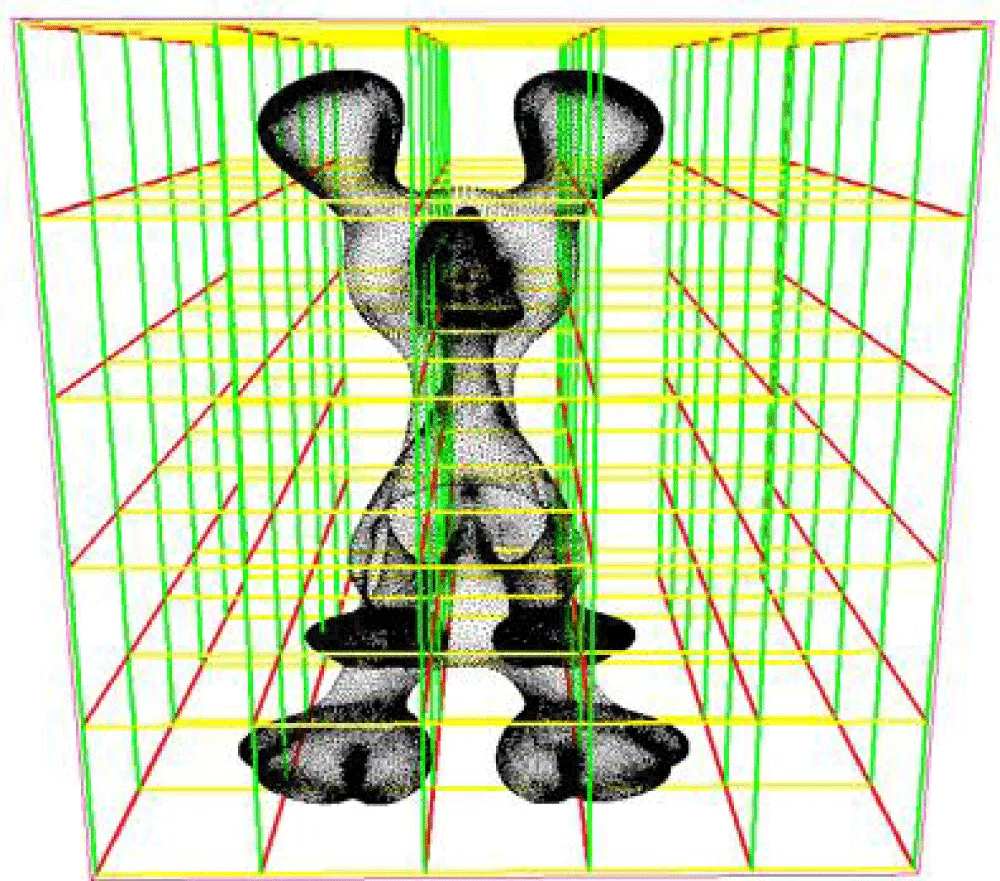 An implicit surface is defined by an analytical equation F(x,y,z)=C MathType@MTEF@5@5@+=feaaguart1ev2aaatCvAUfeBSjuyZL2yd9gzLbvyNv2CaerbuLwBLnhiov2DGi1BTfMBaeXatLxBI9gBaerbd9wDYLwzYbItLDharqqtubsr4rNCHbGeaGqk0Jf9crFfpeea0xh9v8qiW7rqqrFfpeea0xe9Lq=Jc9vqaqpepm0xbba9pwe9Q8fs0=yqaqpepae9pg0FirpepeKkFr0xfr=xfr=xb9adbaqaaeGaciGaaiaabeqaamaabaabaaGcbaGaamOraiaaiIcacaWG4bGaaGilaiaadMhacaaISaGaamOEaiaaiMcacaaI9aGaam4qaaaa@402A@ where (x,y,z) MathType@MTEF@5@5@+=feaaguart1ev2aaatCvAUfeBSjuyZL2yd9gzLbvyNv2CaerbuLwBLnhiov2DGi1BTfMBaeXatLxBI9gBaerbd9wDYLwzYbItLDharqqtubsr4rNCHbGeaGqiVu0Je9sqqrpepC0xbbL8F4rqqrFfpeea0xe9Lq=Jc9vqaqpepm0xbba9pwe9Q8fs0=yqaqpepae9pg0FirpepeKkFr0xfr=xfr=xb9adbaqaaeGaciGaaiaabeqaamaabaabaaGcbaGaaGikaiaadIhacaaISaGaamyEaiaaiYcacaWG6bGaaGykaaaa@3BBD@ belongs to a volume domain and C is a constant called “level” and the corresponding surface is a level set. A discrete representation of this surface is the data values of the underlying function, F( x i , y j , z k ) MathType@MTEF@5@5@+=feaaguart1ev2aaatCvAUfeBSjuyZL2yd9gzLbvyNv2CaerbuLwBLnhiov2DGi1BTfMBaeXatLxBI9gBaerbd9wDYLwzYbItLDharqqtubsr4rNCHbGeaGqk0Jf9crFfpeea0xh9v8qiW7rqqrFfpeea0xe9Lq=Jc9vqaqpepm0xbba9pwe9Q8fs0=yqaqpepae9pg0FirpepeKkFr0xfr=xfr=xb9adbaqaaeGaciGaaiaabeqaamaabaabaaGcbaGaamOraiaaiIcacaWG4bWaaSbaaSqaaiaadMgaaeqaaOGaaGilaiaadMhadaWgaaWcbaGaamOAaaqabaGccaaISaGaamOEamaaBaaaleaacaWGRbaabeaakiaaiMcaaaa@420A@ , at the vertices ( x i , y j , z k ) MathType@MTEF@5@5@+=feaaguart1ev2aaatCvAUfeBSjuyZL2yd9gzLbvyNv2CaerbuLwBLnhiov2DGi1BTfMBaeXatLxBI9gBaerbd9wDYLwzYbItLDharqqtubsr4rNCHbGeaGqk0Jf9crFfpeea0xh9v8qiW7rqqrFfpeea0xe9Lq=Jc9vqaqpepm0xbba9pwe9Q8fs0=yqaqpepae9pg0FirpepeKkFr0xfr=xfr=xb9adbaqaaeGaciGaaiaabeqaamaabaabaaGcbaGaaGikaiaadIhadaWgaaWcbaGaamyAaaqabaGccaaISaGaamyEamaaBaaaleaacaWGQbaabeaakiaaiYcacaWG6bWaaSbaaSqaaiaadUgaaeqaaOGaaGykaaaa@413F@ of a 3D (Cartesian) grid, 1i n i MathType@MTEF@5@5@+=feaaguart1ev2aaatCvAUfeBSjuyZL2yd9gzLbvyNv2CaerbuLwBLnhiov2DGi1BTfMBaeXatLxBI9gBaerbd9wDYLwzYbItLDharqqtubsr4rNCHbGeaGqk0Jf9crFfpeea0xh9v8qiW7rqqrFfpeea0xe9Lq=Jc9vqaqpepm0xbba9pwe9Q8fs0=yqaqpepae9pg0FirpepeKkFr0xfr=xfr=xb9adbaqaaeGaciGaaiaabeqaamaabaabaaGcbaGaaGymaiabgsMiJkaadMgacqGHKjYOcaWGUbWaaSbaaSqaaiaadMgaaeqaaaaa@3F25@ , 1j n j MathType@MTEF@5@5@+=feaaguart1ev2aaatCvAUfeBSjuyZL2yd9gzLbvyNv2CaerbuLwBLnhiov2DGi1BTfMBaeXatLxBI9gBaerbd9wDYLwzYbItLDharqqtubsr4rNCHbGeaGqk0Jf9crFfpeea0xh9v8qiW7rqqrFfpeea0xe9Lq=Jc9vqaqpepm0xbba9pwe9Q8fs0=yqaqpepae9pg0FirpepeKkFr0xfr=xfr=xb9adbaqaaeGaciGaaiaabeqaamaabaabaaGcbaGaaGymaiabgsMiJkaadQgacqGHKjYOcaWGUbWaaSbaaSqaaiaadQgaaeqaaaaa@3F27@ and 1k n k MathType@MTEF@5@5@+=feaaguart1ev2aaatCvAUfeBSjuyZL2yd9gzLbvyNv2CaerbuLwBLnhiov2DGi1BTfMBaeXatLxBI9gBaerbd9wDYLwzYbItLDharqqtubsr4rNCHbGeaGqk0Jf9crFfpeea0xh9v8qiW7rqqrFfpeea0xe9Lq=Jc9vqaqpepm0xbba9pwe9Q8fs0=yqaqpepae9pg0FirpepeKkFr0xfr=xfr=xb9adbaqaaeGaciGaaiaabeqaamaabaabaaGcbaGaaGymaiabgsMiJkaadUgacqGHKjYOcaWGUbWaaSbaaSqaaiaadUgaaeqaaaaa@3F29@ where ( n i , n j , n k ) MathType@MTEF@5@5@+=feaaguart1ev2aaatCvAUfeBSjuyZL2yd9gzLbvyNv2CaerbuLwBLnhiov2DGi1BTfMBaeXatLxBI9gBaerbd9wDYLwzYbItLDharqqtubsr4rNCHbGeaGqk0Jf9crFfpeea0xh9v8qiW7rqqrFfpeea0xe9Lq=Jc9vqaqpepm0xbba9pwe9Q8fs0=yqaqpepae9pg0FirpepeKkFr0xfr=xfr=xb9adbaqaaeGaciGaaiaabeqaamaabaabaaGcbaGaaGikaiaad6gadaWgaaWcbaGaamyAaaqabaGccaaISaGaamOBamaaBaaaleaacaWGQbaabeaakiaaiYcacaWGUbWaaSbaaSqaaiaadUgaaeqaaOGaaGykaaaa@411E@ are three integers defining the resolution of the grid, also implicitly representing the boundaries and so the (discrete) definition volume of the surface. Such a grid is often called a "voxel" grid, as shown in Figure 4.