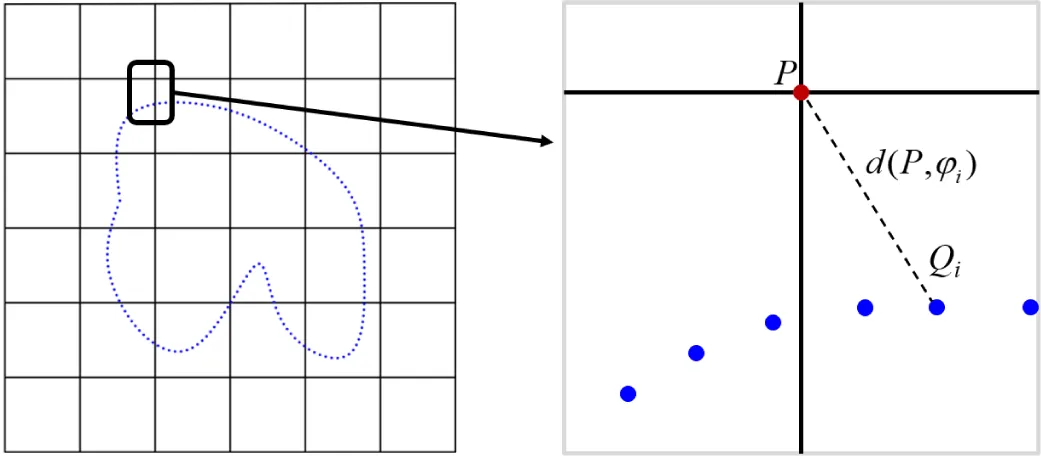Figures 5,6 illustrate this process. Figure 5 shows the topological relation between a grid vertex P and its neighboring point samples { Qi }, while Figure 6 visualizes the local quadratic surface ϕI constructed at a point Qi along with the projection of P onto the surface.