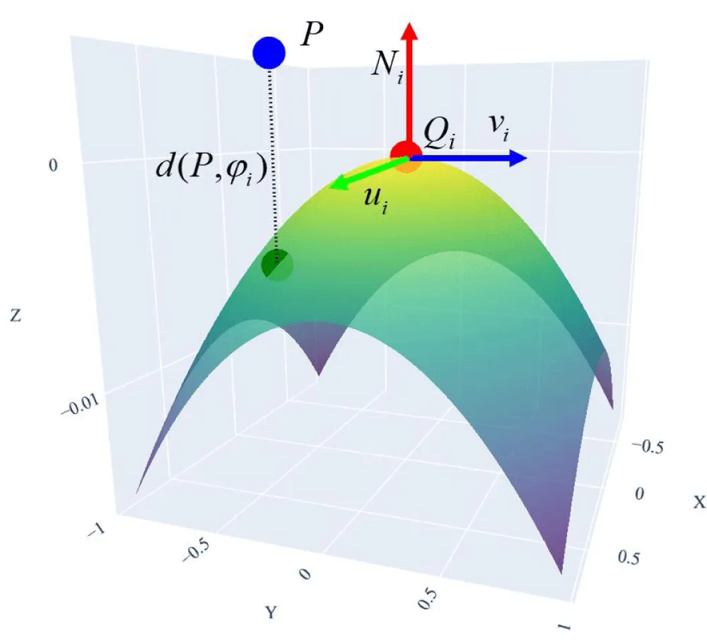 To compute function values F( x i , y j , z k ) MathType@MTEF@5@5@+=feaaguart1ev2aaatCvAUfeBSjuyZL2yd9gzLbvyNv2CaerbuLwBLnhiov2DGi1BTfMBaeXatLxBI9gBaerbd9wDYLwzYbItLDharqqtubsr4rNCHbGeaGqk0Jf9crFfpeea0xh9v8qiW7rqqrFfpeea0xe9Lq=Jc9vqaqpepm0xbba9pwe9Q8fs0=yqaqpepae9pg0FirpepeKkFr0xfr=xfr=xb9adbaqaaeGaciGaaiaabeqaamaabaabaaGcbaGaamOraiaaiIcacaWG4bWaaSbaaSqaaiaadMgaaeqaaOGaaGilaiaadMhadaWgaaWcbaGaamOAaaqabaGccaaISaGaamOEamaaBaaaleaacaWGRbaabeaakiaaiMcaaaa@420A@  at each grid vertex P, we adopt a local approximation strategy based on point cloud data. For each vertex P, the m nearest neighbors { Q i } i=1 m MathType@MTEF@5@5@+=feaaguart1ev2aaatCvAUfeBSjuyZL2yd9gzLbvyNv2CaerbuLwBLnhiov2DGi1BTfMBaeXatLxBI9gBaerbd9wDYLwzYbItLDharqqtubsr4rNCHbGeaGqk0Jf9crFfpeea0xh9v8qiW7rqqrFfpeea0xe9Lq=Jc9vqaqpepm0xbba9pwe9Q8fs0=yqaqpepae9pg0FirpepeKkFr0xfr=xfr=xb9adbaqaaeGaciGaaiaabeqaamaabaabaaGcbaGaaG4EaiaadgfadaWgaaWcbaGaamyAaaqabaGccaaI9bWaa0baaSqaaiaadMgacaaI9aGaaGymaaqaaiaad2gaaaaaaa@3F9A@  in the point cloud are identified (in this paper m = 3 ) . Around each Qi, a local quadratic surface is fitted: