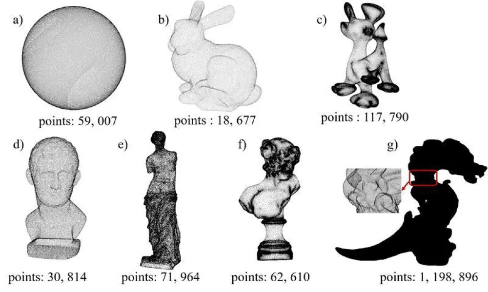 Figure 7 shows the point cloud data (from 18,667 points to 1,198,896 points), Figure 8 shows the corresponding normal estimation, and Figure 9 shows the reconstructed models.