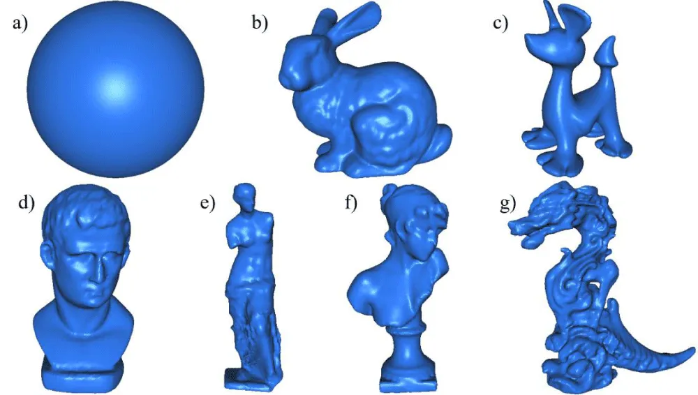 These approaches represent surfaces directly through parametric functions or piecewise polynomial approximations [12,13]. Two widely used methods are Non-Uniform Rational B-Splines (NURBS) and the Bézier method. NURBS construct smooth, continuous surfaces using control points and basis functions, offering precise shape control. NURBS are widely applied in computer-aided design and industrial design; however, they require a predefined topology and involve complex fitting procedures, particularly for large-scale or noisy datasets. Bézier and B-Spline Surfaces provide mathematical representations for smooth surface modeling, yielding high-quality results in computer-aided design. However, their adaptability is limited when applied to unstructured point clouds or datasets with missing information.