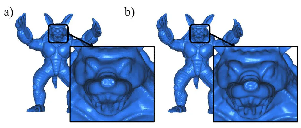 As demonstrated by the examples above, the proposed approach produces smoother geometric reconstructions across different levels of detail compared to existing methodologies. For illustration, Figure 13 presents a comparison between a reconstructions obtained using the Poisson method and one generated by our proposed approach.
