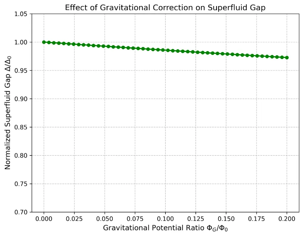 represents the quantum gravity coupling coefficient, while 𝜀 is the localized gravitational fluctuation potential function. The introduction of this term not only modifies the spatial distribution of pairing energy gaps but also induces quasi-flat band states in the system's spectral profile within high-curvature regions. This modification carries dual significance: Firstly, it provides a quantitative approach to characterize the superconducting transition temperature of neutron matter under gravitational perturbations; secondly, it may reveal non-perturbative coupling mechanisms between quantum gravity and nuclear matter.