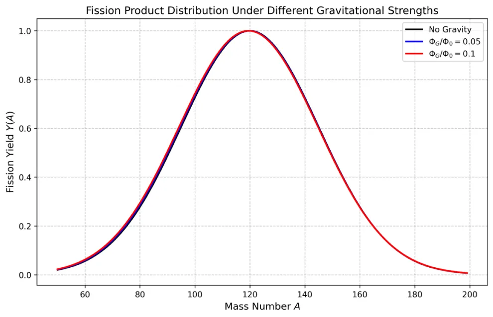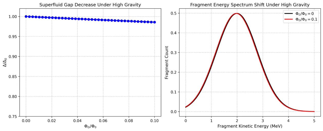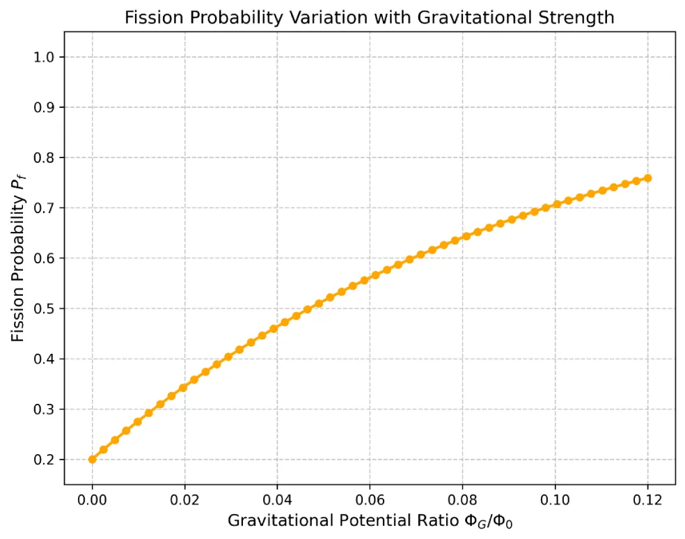χ denotes the gravitational constant, χ represents the local excitation energy, χ is the effective nuclear radius, and χ is the modulation coefficient. This modified expression reveals a subtle collapse effect of fission barriers under strong field conditions. Although this phenomenon may be difficult to directly observe under Earth-based experimental conditions, it could potentially yield measurable physical consequences in high-energy accelerator target systems or neutron star collision environments.