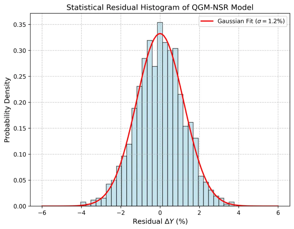 Figure 12: Statistical residual histogram, showing that the model residual is distributed according to a Gaussian distribution.