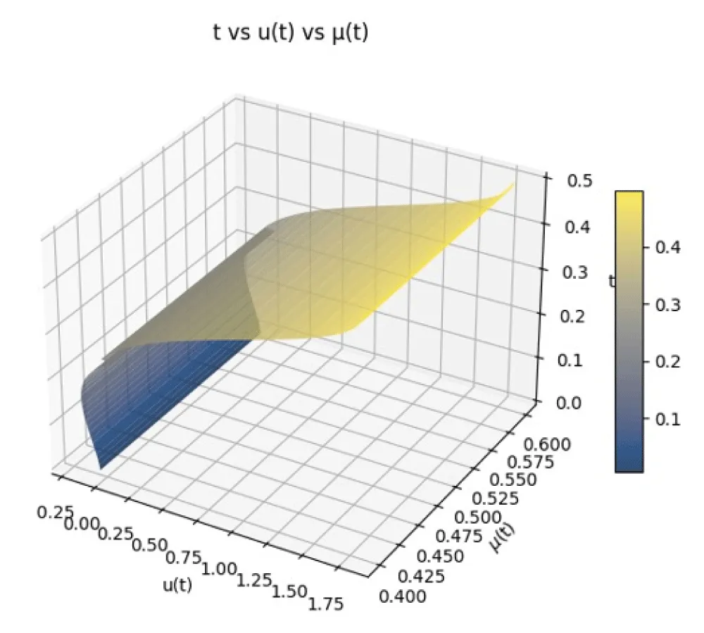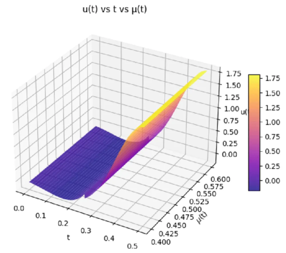 The three 3D plots display how u(t) evolves with time and the variable order µ(t). The solution remains smooth and single valued throughout [0, T], providing numerical confirmation of its uniqueness.