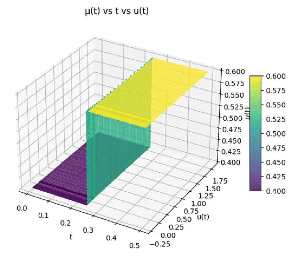 µ(t) with time t, highlighting the piecewise-constant behavior and its influence on