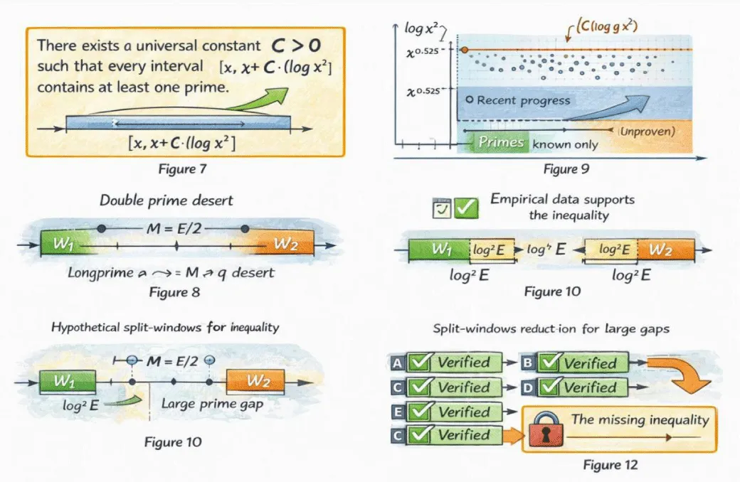 Figure 7 (Top–Left) — Explicit statement of the missing inequality. The top-left panel displays the central unresolved inequality of the framework: the requirement that every interval of length proportional to log(E)² must contain at least one prime. The figure isolates this inequality visually, emphasizing that it is independent of symmetry, parity, or additive structure. This panel establishes the exact analytic condition whose proof would complete the argument.