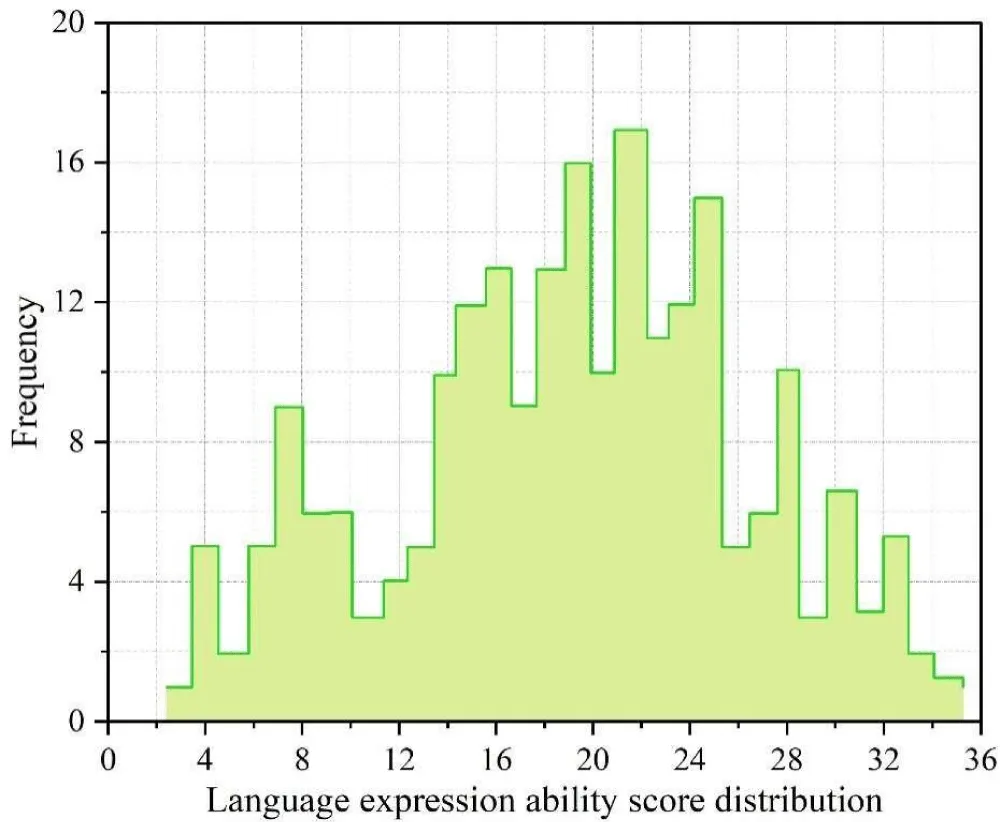 The frequency distribution of students' language expression ability scores is presented in Figure 2, based on data collected from 543 valid respondents. The score intervals range from 0-4 to 32-36, with frequencies distributed across ten distinct categories. Examination of the distribution reveals that the modal frequency occurs within the 20-24 score interval, where 28 students achieved scores in this range, followed closely by the 24-28 interval with 24 students and the 16-20 interval with 17 students. The distribution demonstrates a progressive increase in frequency from the lowest score interval (0-4, n = 4) toward the central score ranges, followed by a gradual decline through the upper intervals (28-32, n = 8; 32-36, n = 2). This pattern suggests that the majority of students' language expression abilities are concentrated in the intermediate score ranges, with progressively fewer students exhibiting extremely low or extremely high proficiency levels.