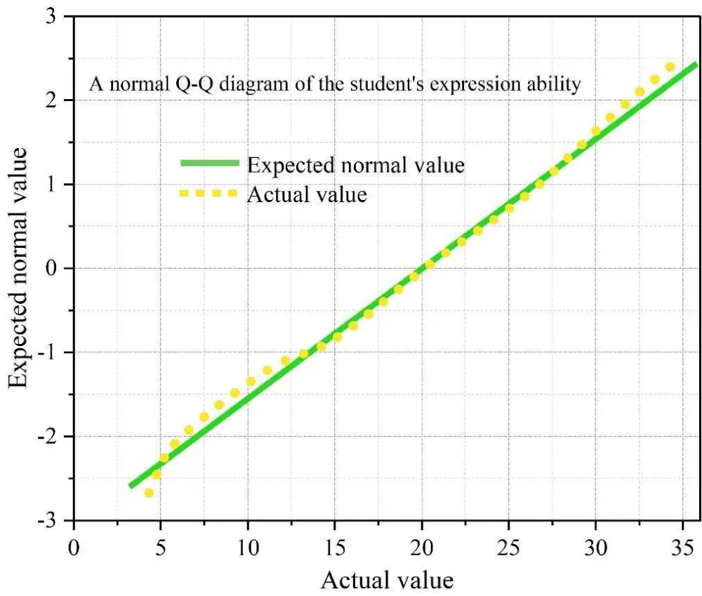 To further assess the normality assumption essential for subsequent parametric analyses, a normal Q-Q (Quantile-Quantile) plot was generated for the language expression ability scores, as depicted in Figure 3. The Q-Q plot provides a graphical comparison between the observed quantiles of the score distribution and the expected quantiles under a theoretical normal distribution. Examination of the plot reveals that the observed data points cluster closely along the diagonal reference line, with only minor deviations observed at the extreme lower and upper tails of the distribution. This linear alignment indicates that the empirical distribution of language expression scores corresponds closely to the expected normal distribution, thereby confirming the tenability of the normality assumption for the dataset.