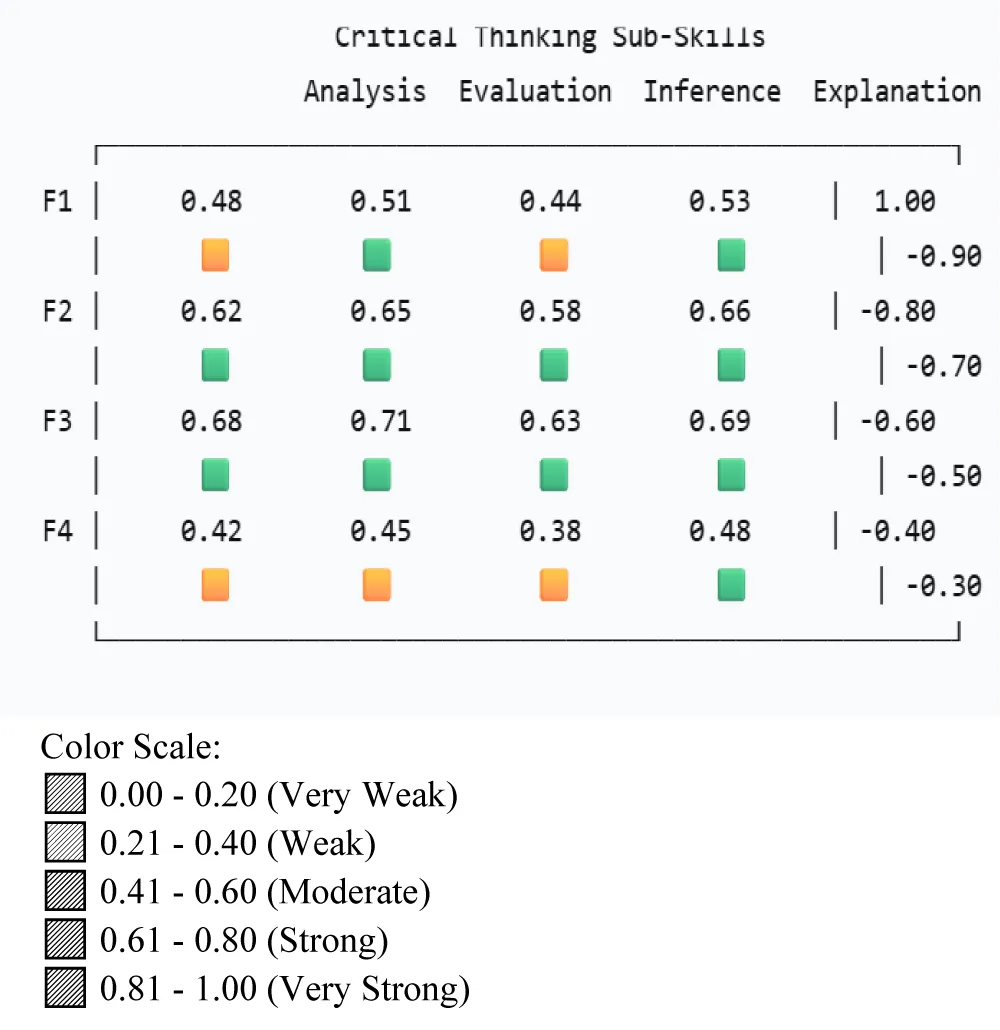 Interactive Engagement (F1) exhibits moderate correlations with critical thinking sub-skills (r = 0.44 to 0.53), suggesting that while multimedia tools and interactive simulations contribute to cognitive development, their effect may be less pronounced than socially-mediated learning activities. Personalized Learning (F4) demonstrates the weakest, though still statistically significant, correlations (r = 0.38 to 0.48), indicating that adaptive learning technologies and self-paced modules, while valuable for individualized instruction, may require additional scaffolding to maximize their impact on higher-order thinking. Among the critical thinking sub-skills, Evaluation shows the strongest overall correlations with the digital pedagogy components, particularly with F3 (r = 0.71) and F2 (r = 0.65), suggesting that digitally-mediated social interaction may be especially effective in developing students' capacity to assess credibility and judge the quality of arguments.
