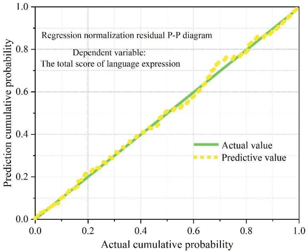 The proximity of the observed values to the diagonal line throughout the central portion of the distribution is particularly noteworthy, as this region carries the greatest weight in parametric estimation procedures. The minimal departures observed at the distributional extremes correspond to the relatively small frequencies in the 0-4 and 32-36 score intervals, which exert limited influence on the overall statistical inferences. This pattern corroborates the skewness and kurtosis statistics reported earlier, providing convergent evidence that the language expression ability scores conform adequately to the normal distribution assumption underlying parametric regression analysis and justifying the application of least squares estimation methods in the subsequent modeling procedures.